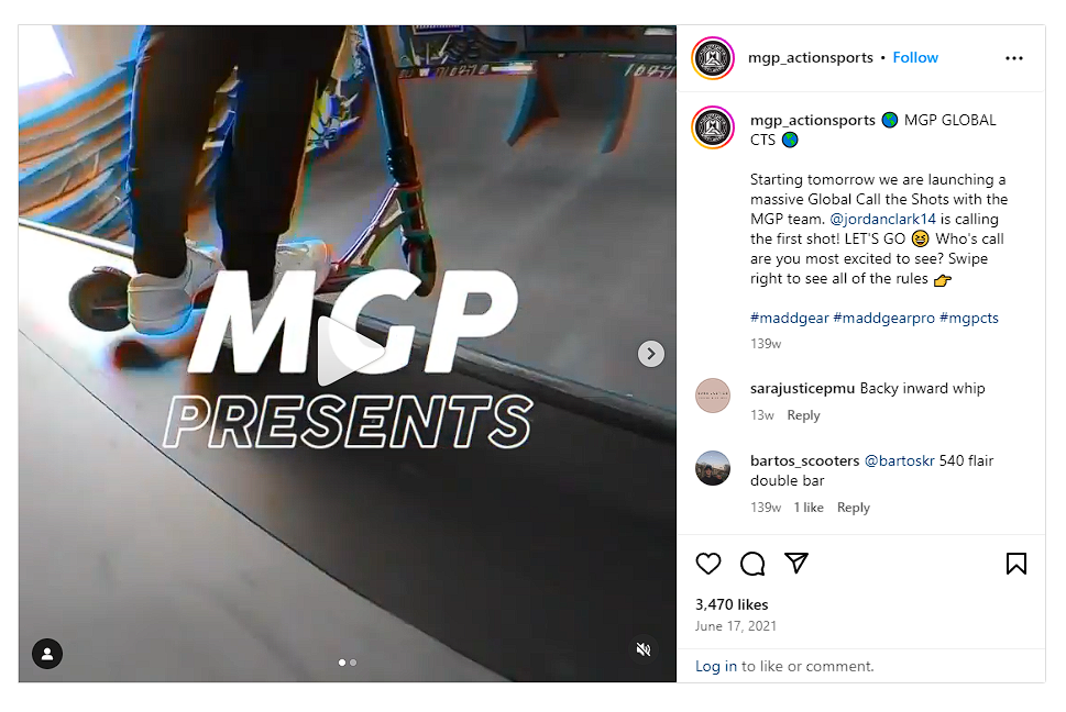 Call the shots is a common game in action sports where one teammate calls a trick for another and the chain repeats itself until each teammate has completed their shot. This was Madd Gear's first time promoting this challenge. Anticipation and excitement were the main emotions wanted to be drawn out from social media with the use of a hype video and graphics explaining the challenge.